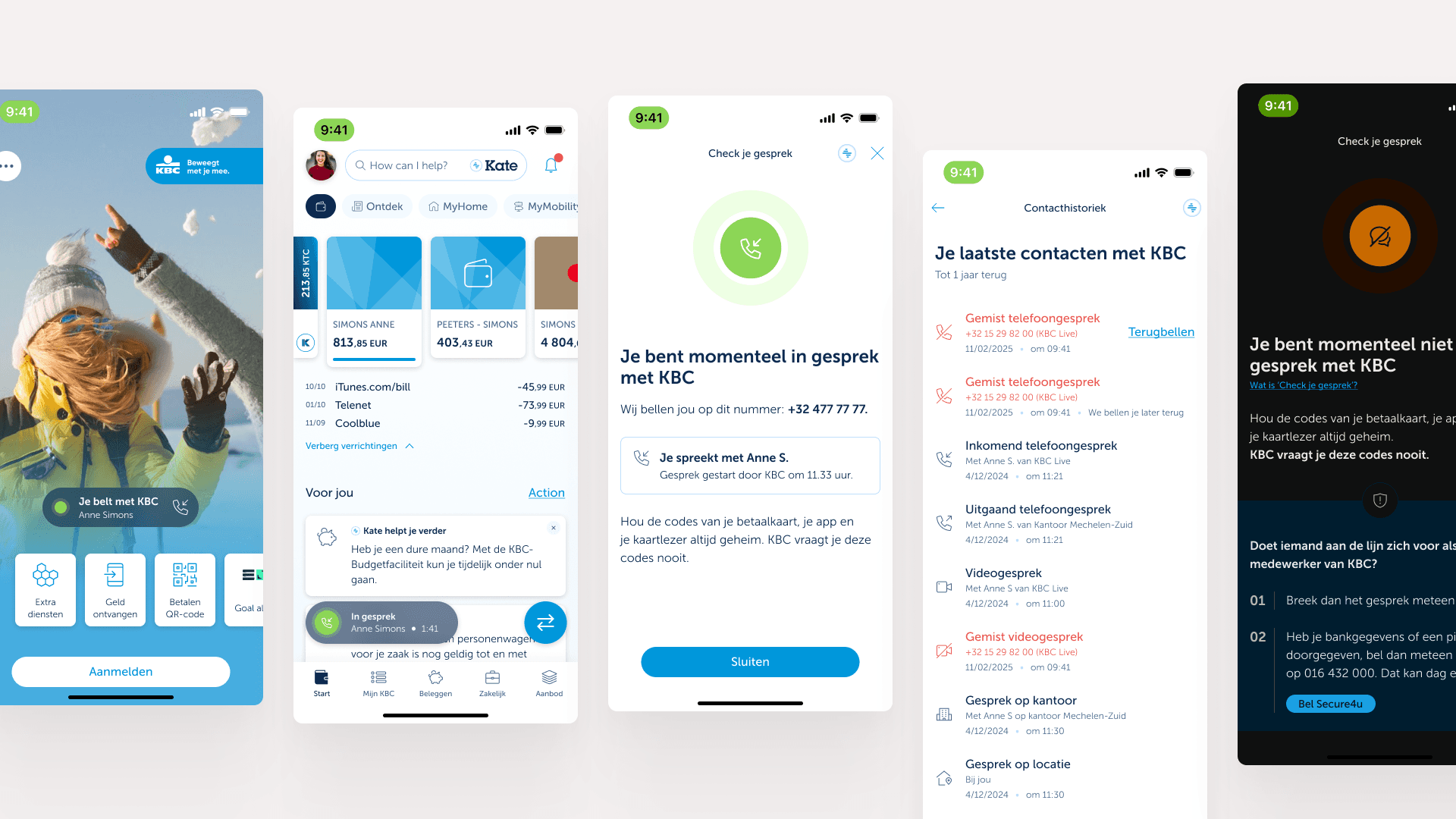 Het werkt zo dat je tijdens een gesprek in de app de knop “Check je gesprek” kunt gebruiken. De app controleert dan of er op dat moment een actief contact met KBC bestaat. Krijg je de bevestiging, dan kun je gerust verder praten; krijg je géén bevestiging, dan is de kans groot dat het om een fraudeur gaat en moet je het gesprek beëindigen en KBC’s fraudedienst Secure4u contacteren.