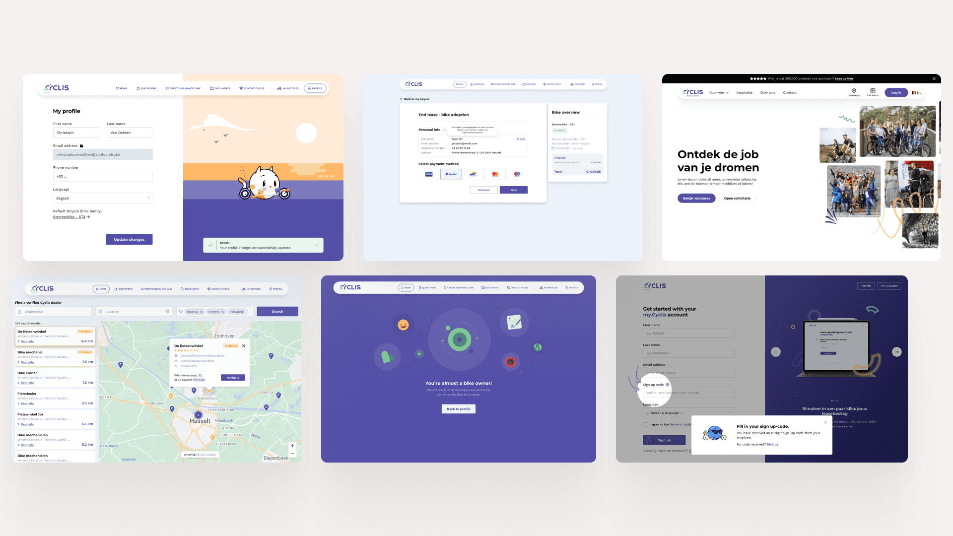 Via een reeks designworkshops bracht ik samen met stakeholders de belangrijkste pijnpunten in kaart. Dit vormde de basis voor een volledige redesign van de Cyclis-website en de verdere uitwerking van het klantenplatform. Van wireframes, informatiearchitectuur en UX-flows tot UI-design, motion design en responsieve uitwerking. Daarbij werkte ik nauw samen met developers en de klant om technische haalbaarheid en een vlotte implementatie te garanderen.
